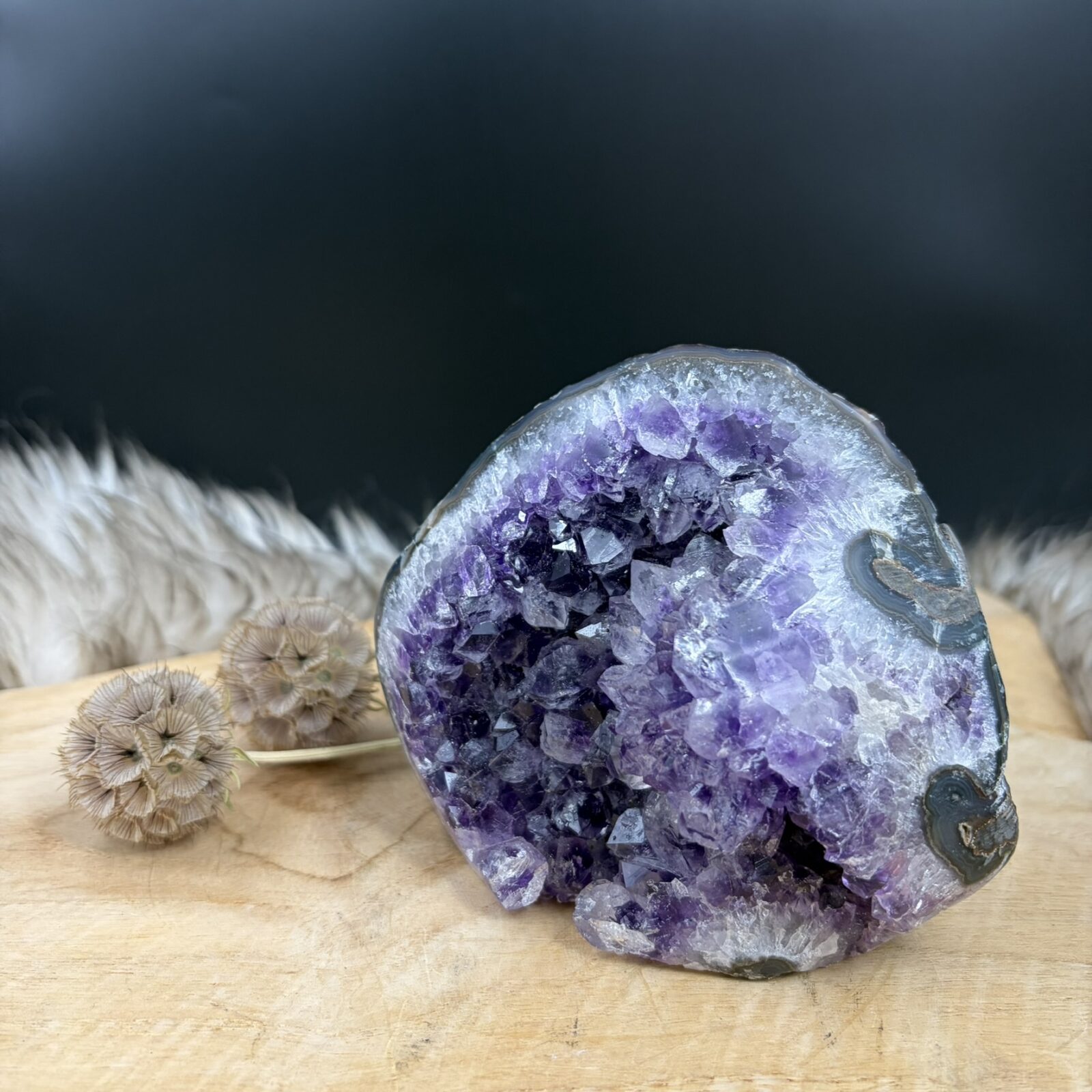 Hoe vind je de rust terug als de dag aan je voorbij raast? Ga even zitten bij deze Amethist Cut-base. Kijk naar de dieppaarse kristallen en voel de kalmte die de steen uitstraalt. De amethist nodigt je uit om even stil te staan bij jezelf. Adem rustig in en uit. De steen helpt je om weer te landen en de drukte los te laten. Dit krachtige stuk natuur uit Uruguay is er altijd voor je.