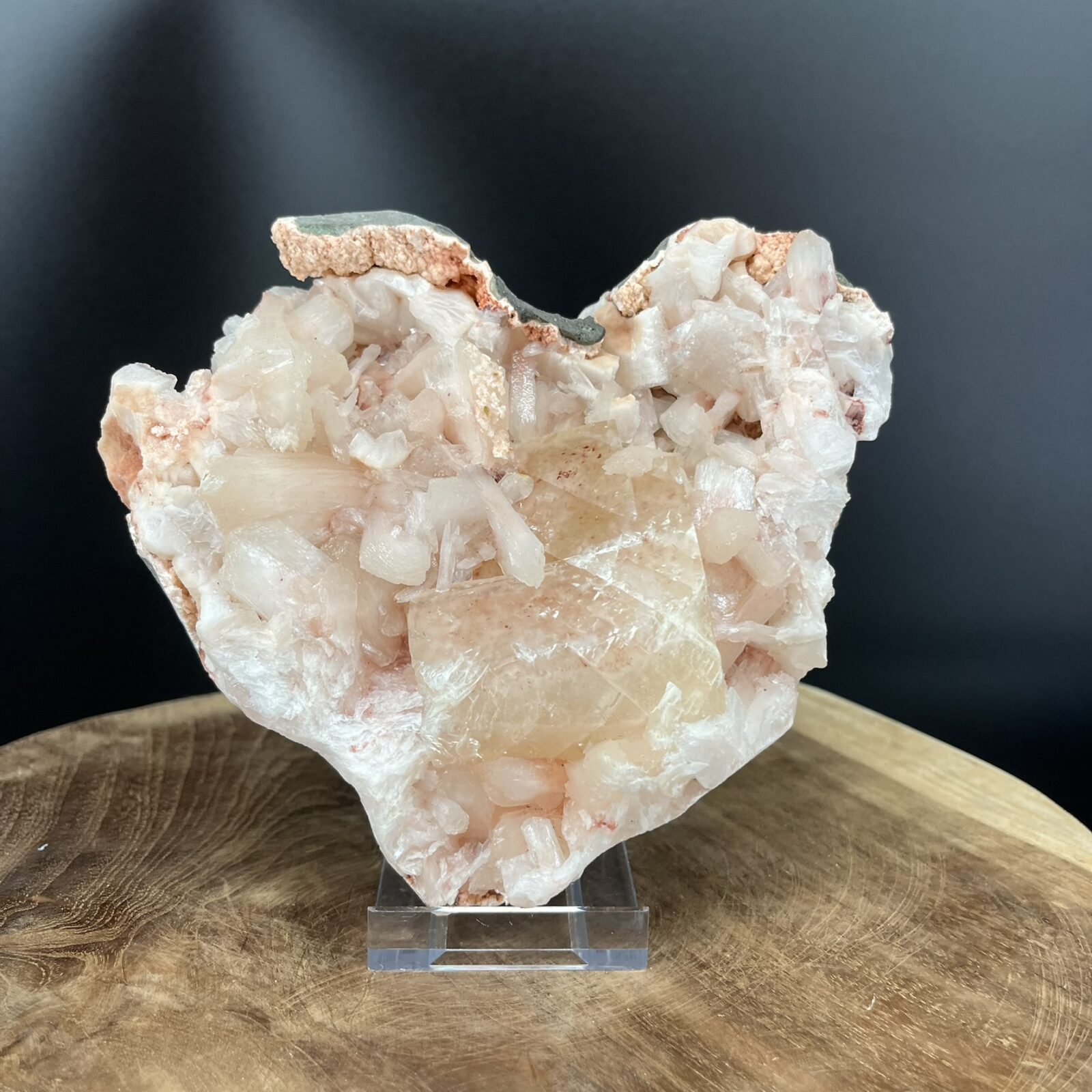 Deze bijzondere formatie komt uit India en hoort bij de India mix – een verzameling van zeolieten zoals apofyliet, stilbiet, heulandiet en calciet die samen in dezelfde gesteentelagen groeien.
