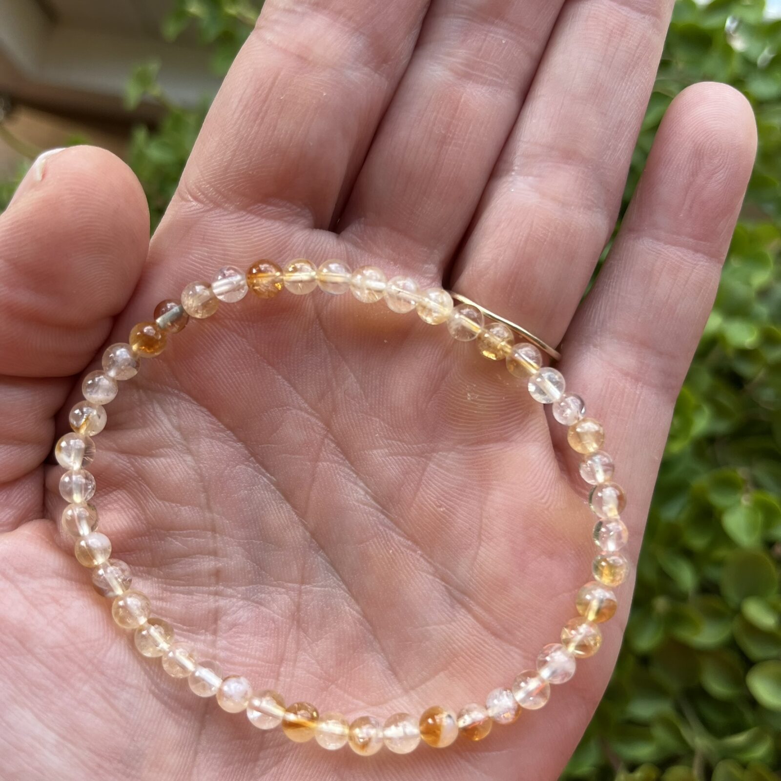 Een elastische armband met kleine citrien kralen van 4 mm en een totaalgewicht van 0,010 gram.