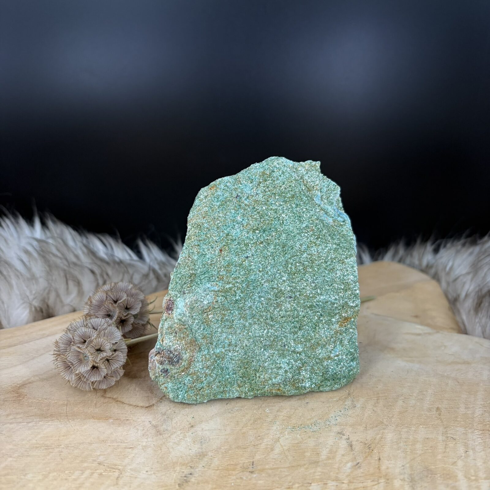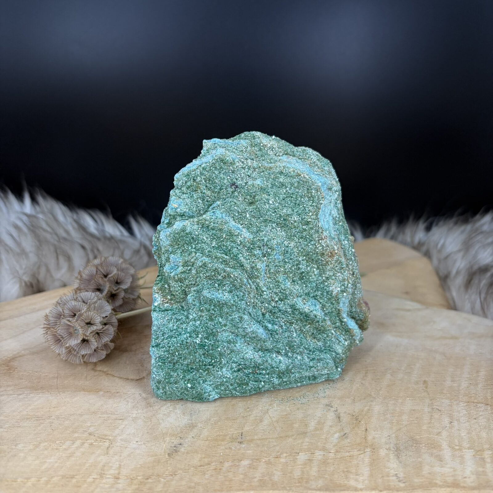 Stel je voor dat je na een drukke dag thuiskomt. Je hebt veel mensen gesproken en je hoofd zit vol. Dan zie je deze groene fuchsiet staan. De zachte kleur en de lichte schittering nodigen je uit om even diep adem te halen. Je hoeft even helemaal niets. De steen herinnert je eraan dat je mag rusten en dat je goed bent zoals je bent. Het is een rustpunt in de kamer dat niet om aandacht vraagt, maar het wel geeft zodra je ernaar kijkt. Het groen brengt een stukje natuur naar binnen, waardoor de sfeer in huis direct zachter wordt. Het is een uitnodiging om de dag los te laten en weer bij jezelf te komen.