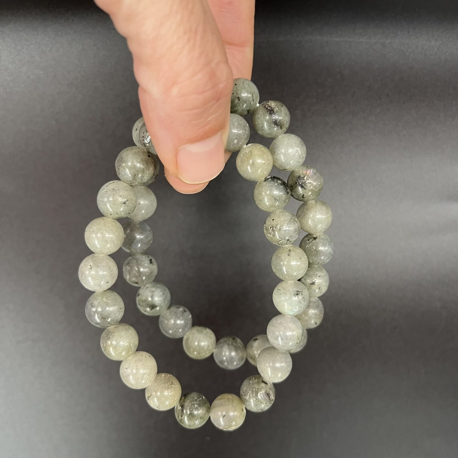 Een elastische armband met glanzende labradoriet kralen van 10 mm, met een totaalgewicht van 32 gram.