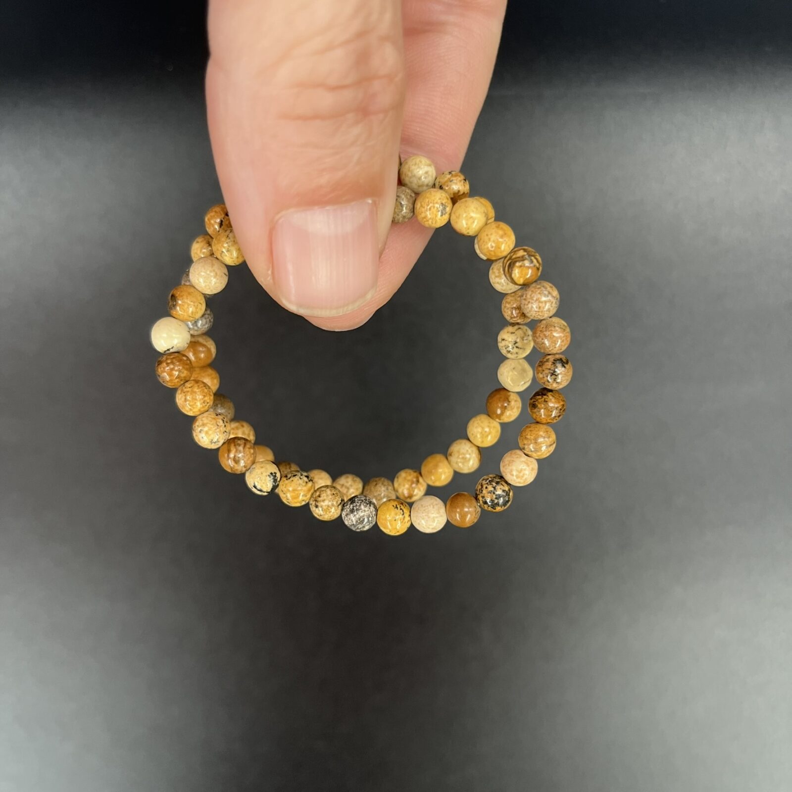 Een elastische armband van natuurlijke Landschap Jaspis kralen, speciaal geschikt voor kindermaten.