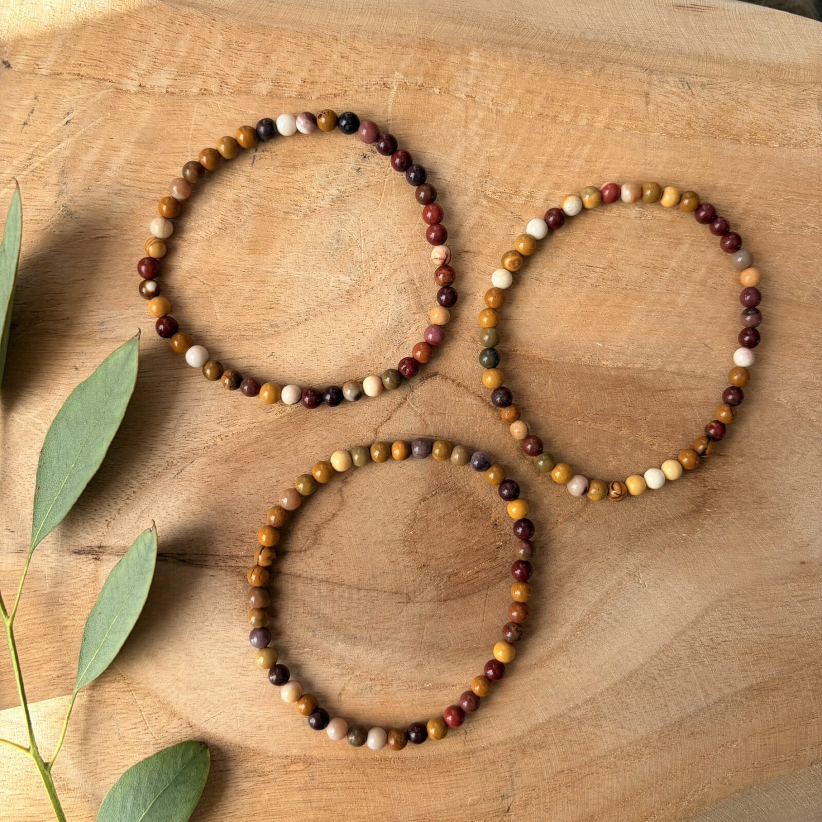 Mookaiet jaspis is een zeldzame steensoort die alleen voorkomt bij Mooka Creek in West-Australië. In de taal van de Aboriginals betekent ‘Mooka’ stromend water. De Mookaiet jaspis armband 4 mm laat een prachtig kleurenpalet zien van geel, rood, bruin, crème en soms lila. Elke kraal is uniek, waardoor geen twee armbanden hetzelfde zijn. Een echt natuurproduct met een eigen karakter.