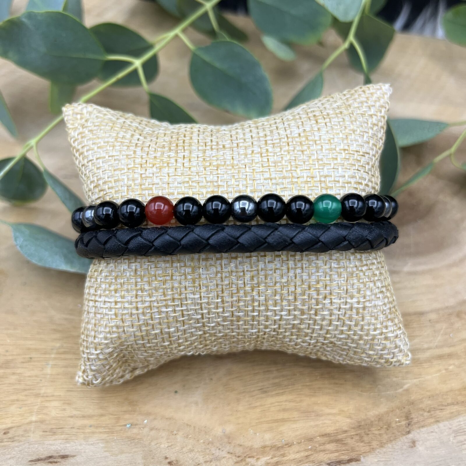 Een stijlvolle combinatie van een leren band en een kralenarmband met agaat, onyx en hematiet. De armband is 21,5 cm en dankzij het verlengstukje ook te dragen tot 23 cm.
