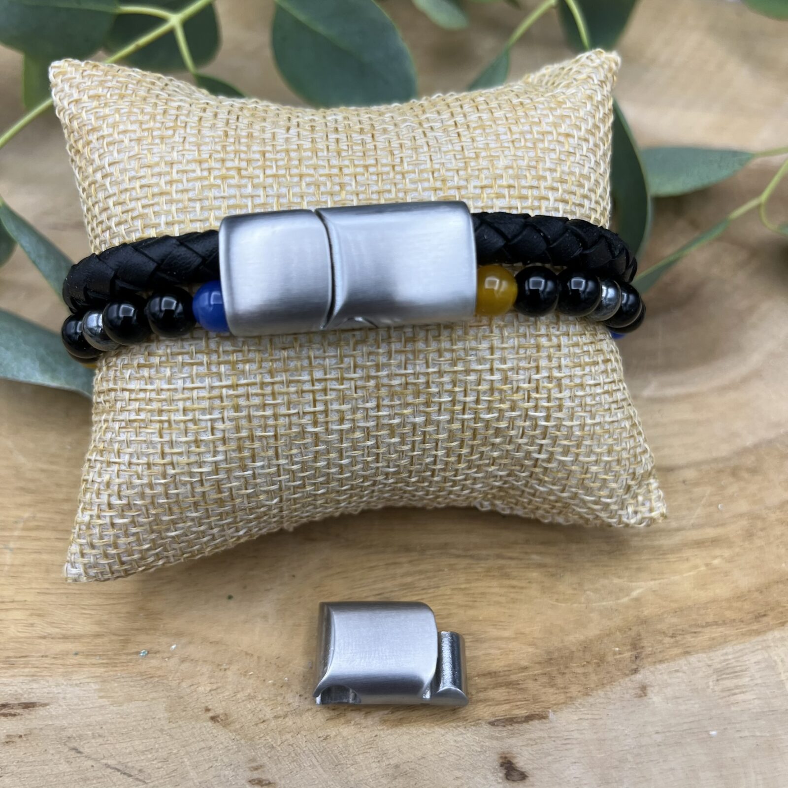 Om de energie van agaat, onyx en hematiet fris te houden, kun je de armband regelmatig ontladen en opladen. Ontladen kan eenvoudig door hem bij hematiet steentjes neer te leggen. Opladen doe je veilig in het zachte licht van de maan.