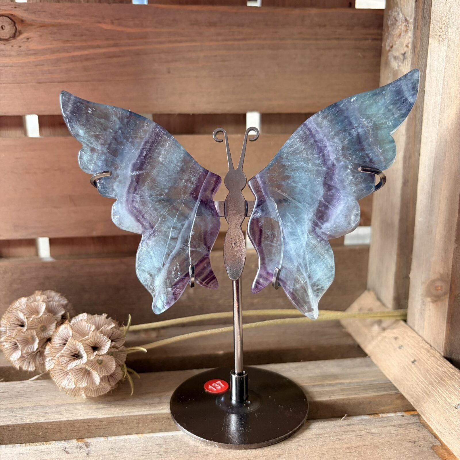 In de therapie wordt Regenboog Fluoriet gebruikt om mentale blokkades op te lossen. Hij helpt om verwarde gedachten te ordenen en structuur aan te brengen in je leven. De steen werkt krachtig op alle chakra’s door zijn verschillende kleuren. Volgens de kristallenleer helpt deze vlinder op standaard om je aura te reinigen en te stabiliseren. Zet hem op een plek waar je veel werkt of leest voor een constant gevoel van focus en mentale kracht.