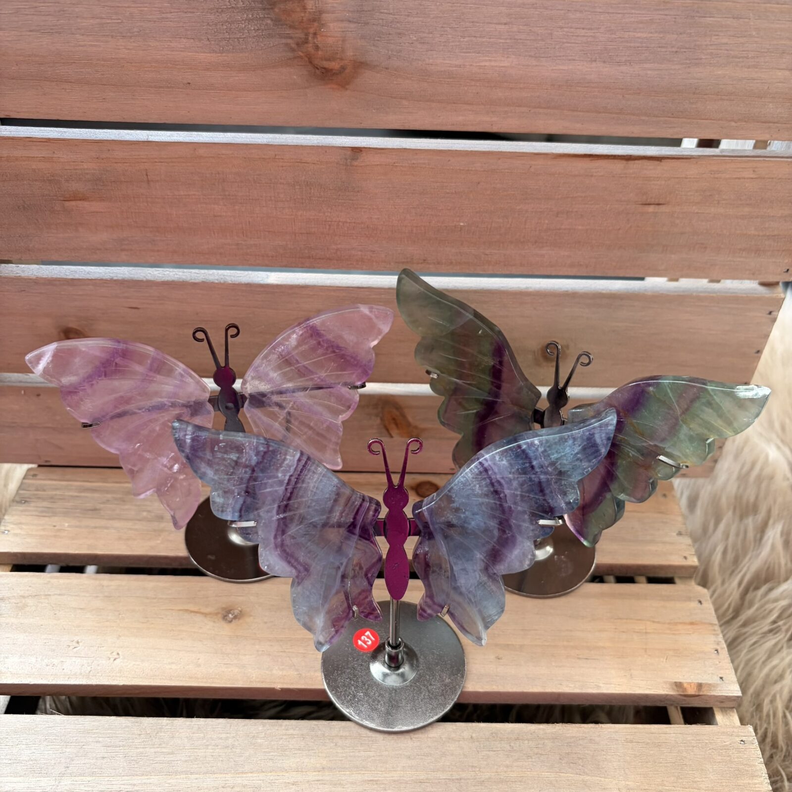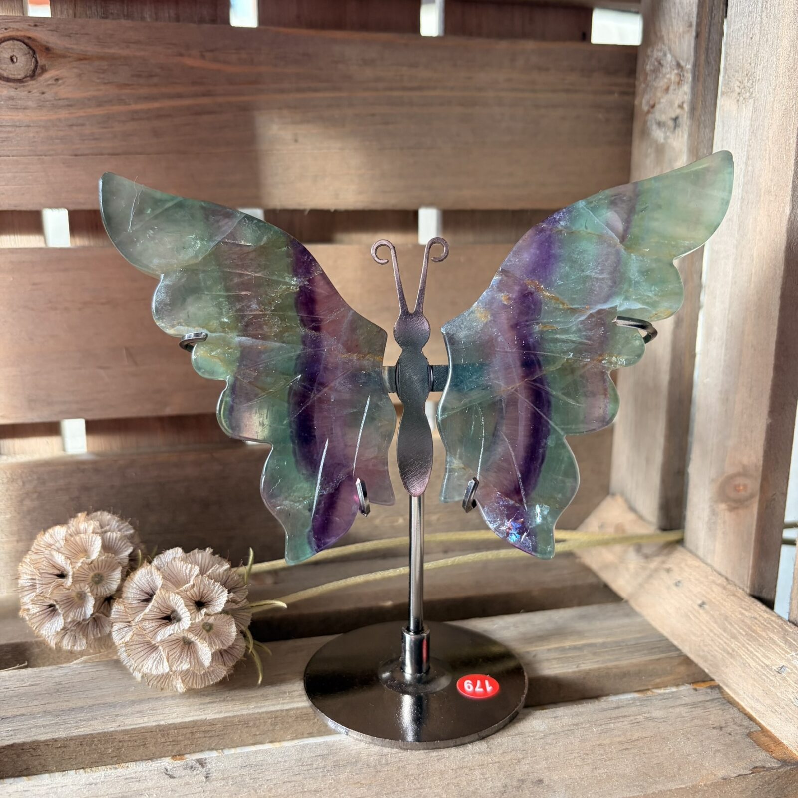 De kleur van een edelsteen zegt veel over zijn werking. Regenboog Fluoriet bevat vaak paars, groen, blauw en geel. In de kleurenleer staat paars voor spirituele wijsheid en groen voor genezing en groei. Blauw brengt rustige communicatie en geel geeft je zelfvertrouwen. Als je naar de kleuren van deze vlinder kijkt, krijgt je brein een seintje om weer in balans te komen. Het neerzetten van dit kleurrijke item is een makkelijke manier om een vrolijke en heldere sfeer in je kamer te creëren.