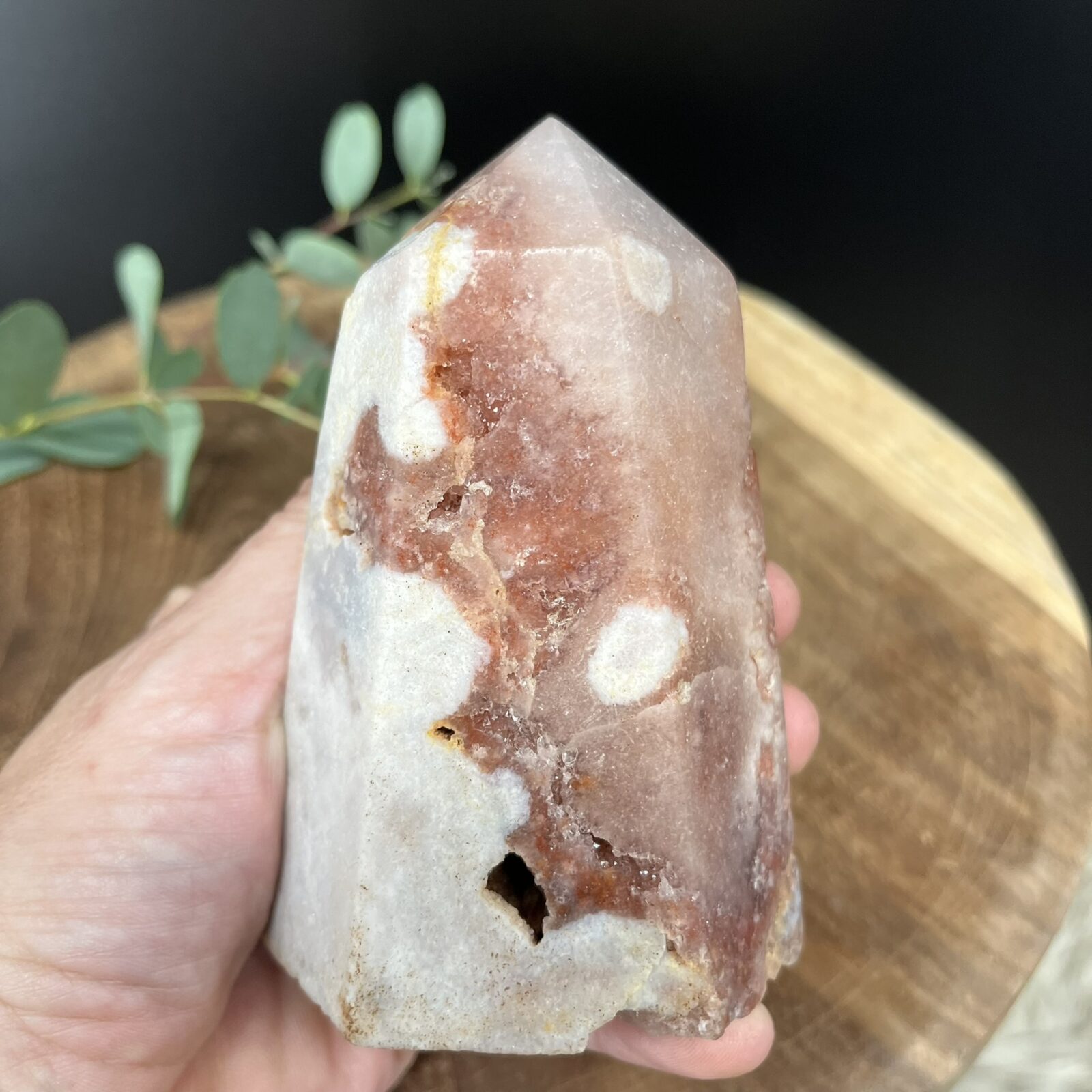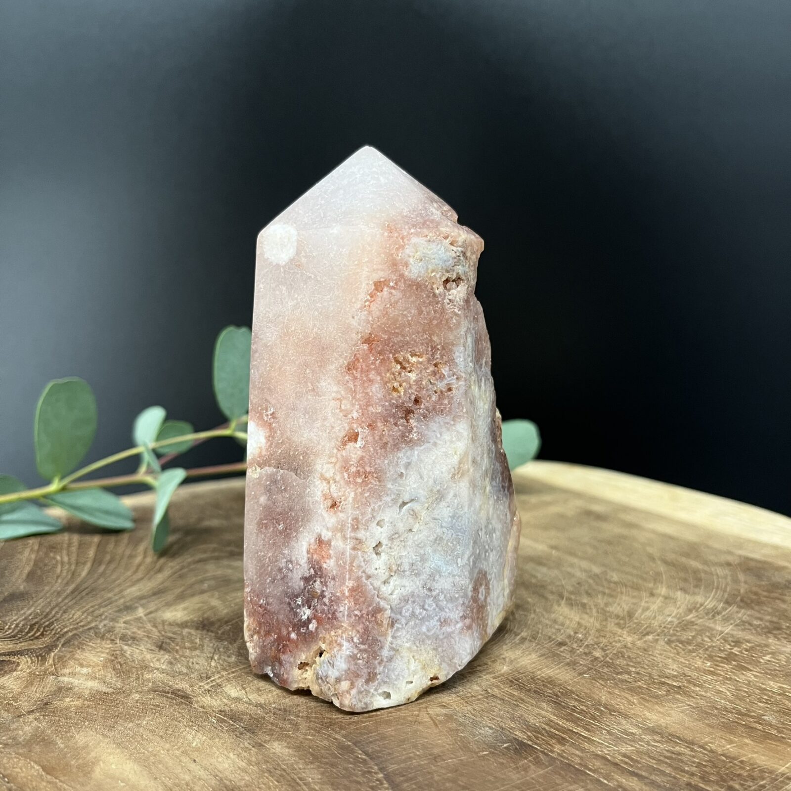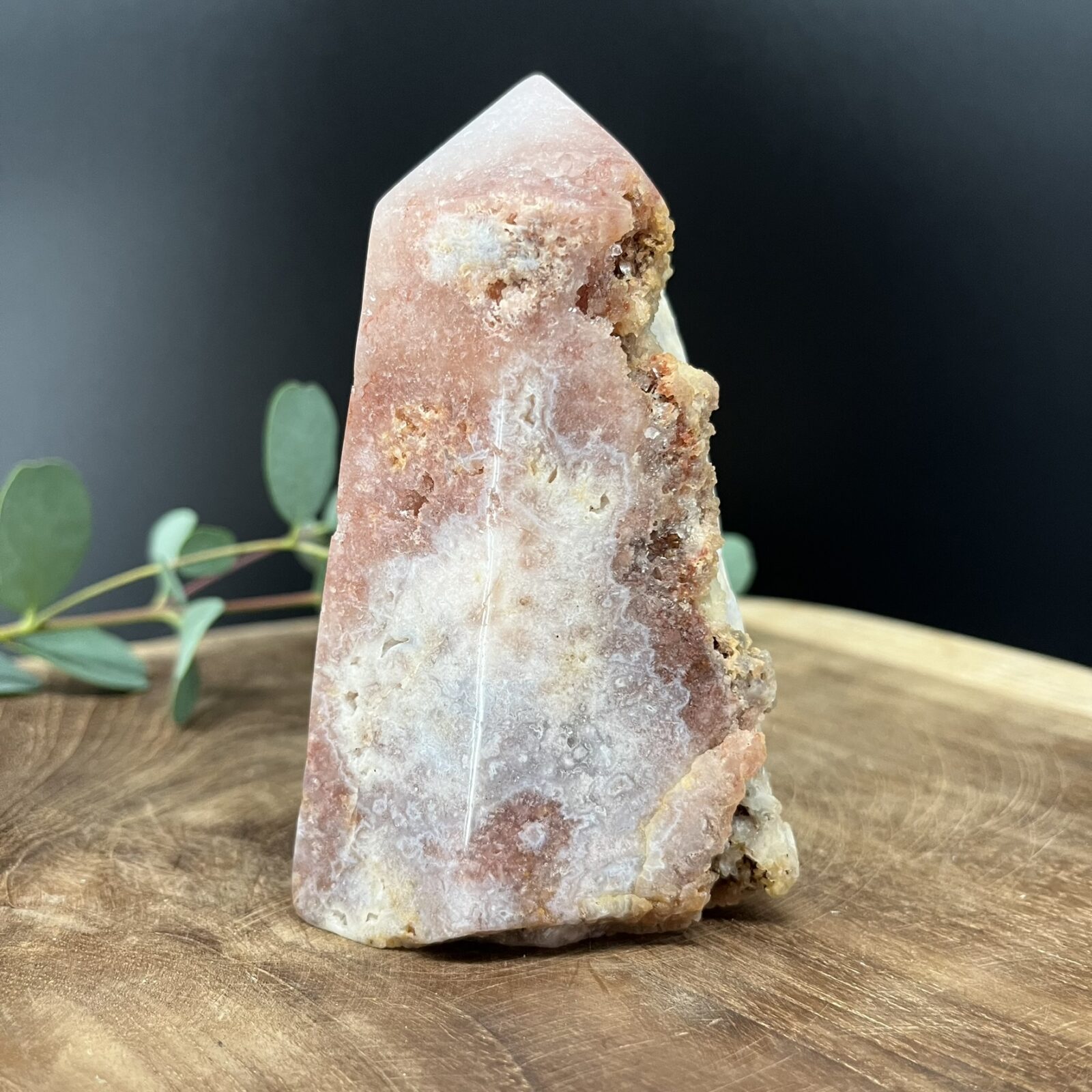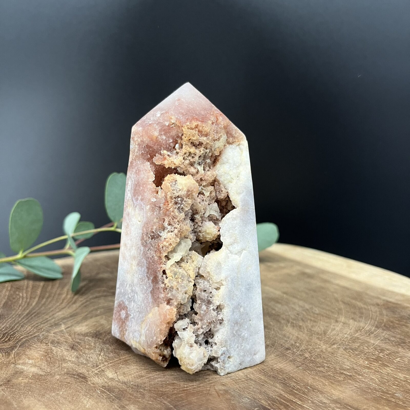 Roze amethist werd pas recent ontdekt in Zuid-Amerika en heeft sindsdien een vaste plek veroverd in de wereld van edelstenen. De steen combineert de rustgevende energie van paarse amethist met de zachtheid van roze chalcedoon, wat haar geliefd maakt bij zowel verzamelaars als interieurstylisten. Elk stuk is uniek – de ruwe structuur, zichtbare kristallen en puntige top maken van deze toren een exclusief natuurkunstwerk dat rust en schoonheid samenbrengt.