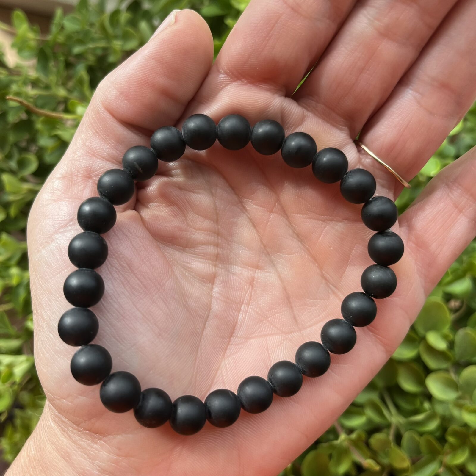 Een elastische armband met matte zwarte obsidiaan kralen van 8 mm, met een totaalgewicht van 15 gram.